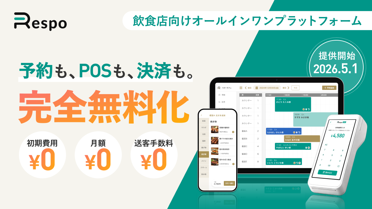 Hello, Inc. (Head Office: Shibuya-ku, Tokyo; Representative Director: Yuki Hariguchi), the company behind Respo, an all-in-one management platform for restaurants, today announced that its core features—reservation ledger, channel manager, POS, mobile ordering, and payment terminals—will be offered across Japan starting May 1, 2026, with zero initial cost, zero monthly fee, and zero customer acquisition fee.