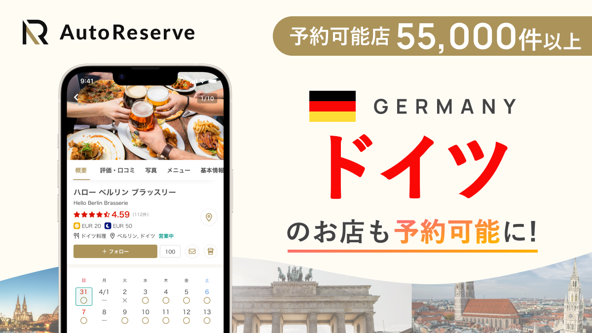 「AutoReserve」にドイツのレストラン情報の掲載を新たに開始いたしました。 これにより、言語の障壁なく、ミシュランスター付きレストランから地元で愛される隠れ家的な名店まで、約5万5千件のレストランの予約が可能になります。本場のシュニッツェル、ザウアーブラーテン、リースリングワインなど、ドイツ料理の真髄を存分に味わえる機会を提供します。